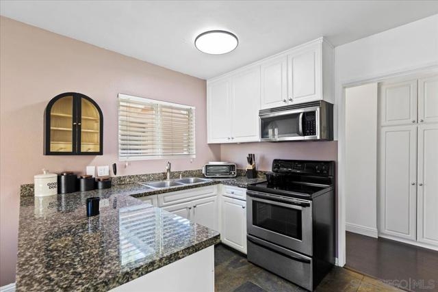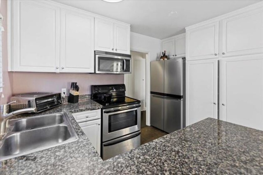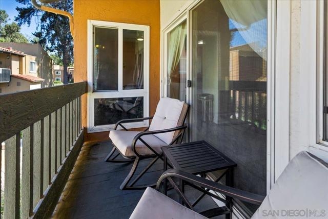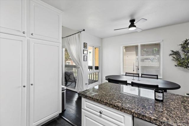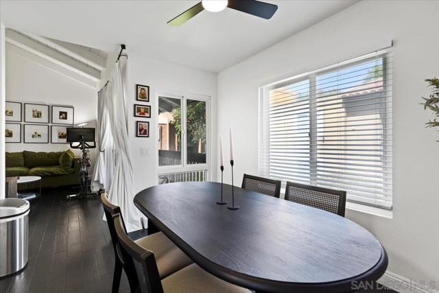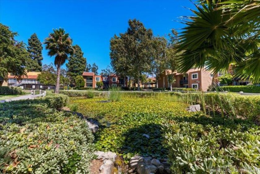 Tucked within the tranquil, park-like setting of the Waterbridge community in Rancho Bernardo, this beautifully appointed second-story end-unit offers a rare blend of privacy, natural light and thoughtful design. With only one shared wall, the home welcomes you with rich wood flooring that leads to an expansive living room adorned with soaring beamed ceilings and a serene private balcony. The open-concept layout flows seamlessly into a sun-drenched dining area and an upgraded kitchen featuring timeless granite countertops, stainless steel appliances, and generous cabinetry. There are two well-proportioned bedrooms, including a spacious primary suite with an oversized closet and a modern ensuite bathroom complete with designer cabinetry, granite surfaces, and a tastefully remodeled shower. A clever 1.25-bath configuration provides a separate vanity for added convenience and privacy. Additional highlights include central A/C, in-unit laundry with a stacked washer/dryer in the private balcony closet, dual-pane windows, and a dedicated parking space. Residents of Waterbridge enjoy beautifully landscaped grounds with meandering walking paths, tranquil ponds with fountains, and resort-style amenities such as a sparkling pool, separate children’s pool, spa, fitness center, clubhouse, BBQ and picnic areas and a playground. Ideally located just across from the Westwood Club and minutes to Westwood Elementary, local dining, shops, and major freeways, this home offers both peaceful retreat and everyday convenience in one of San Diego’s most desirable neighborhoods.