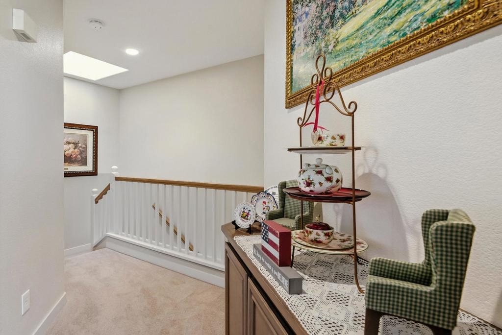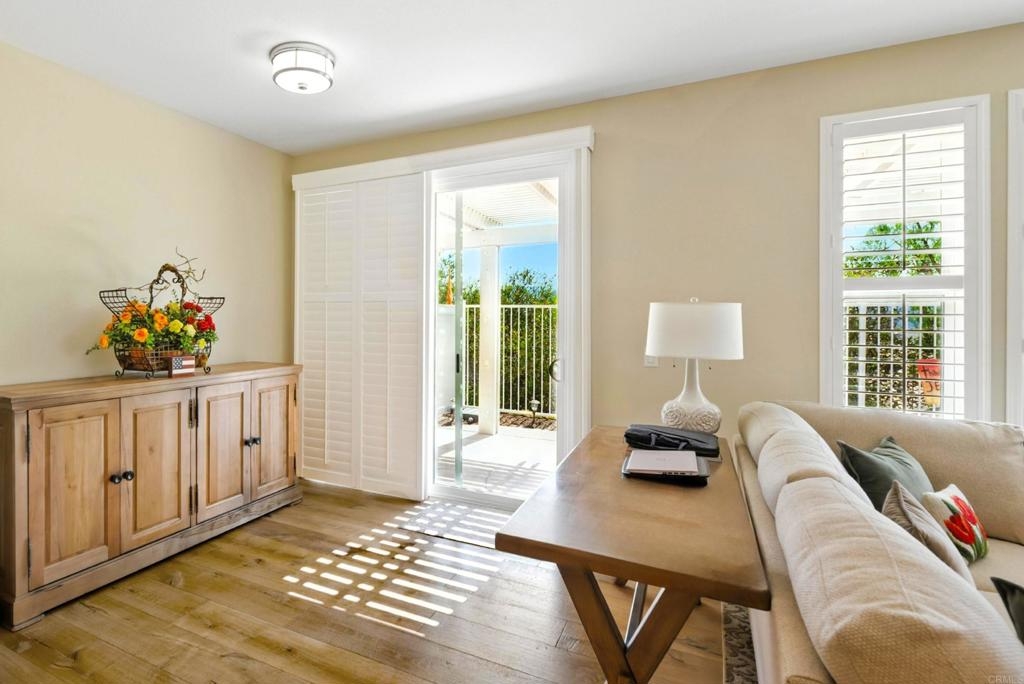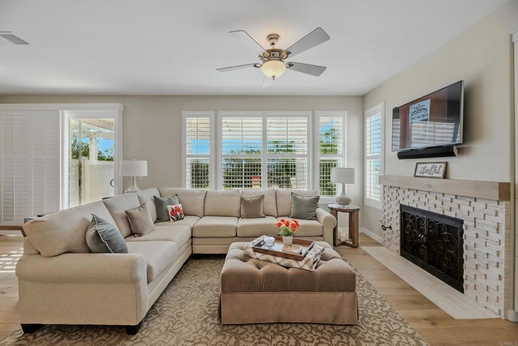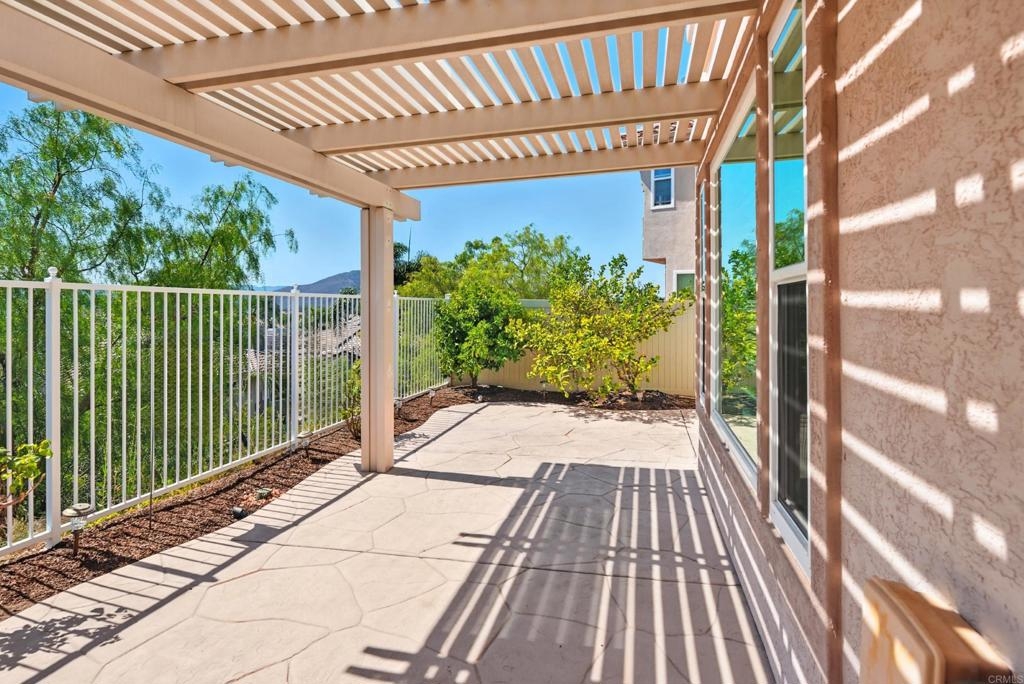 DISCOVER THE BEAUTY BEHIND THE GATES OF VISTA DEL LAGO! Highly upgraded townhome with panoramic mountain and sunset views. Upon arriving you will notice the extra space between this building and the neighbor providing privacy and a larger than most backyard updated with stamped concrete, roses, fruit trees, an aluminum patio cover and newer vinyl fencing. Design winning floorplan when built by DR Horton for its spacious/open design. Remodeled kitchen has all newer cabinetry and plenty of soft close drawers and soft close doors with polished nickel hardware topped with gleaming quartzite countertops and shiny subway tile, stainless steel Whirlpool 5 burner gas stove, oven, French door refrigerator, Bosch dishwasher, large farm sink with polished nickel faucet and informal dining area, polished nickel light fixture and updated canned lighting opening to a large great room with engineered wood flooring throughout featuring a gas fireplace with custom screen doors, stone jigsaw piece effect facing enhanced by a wood mantle matching the floors. Entire home has newer, dual paned windows solid wood interior doors and plantation shutters. Upstairs are dual primary suites-one with a panoramic view has an amazing updated tile walk in shower and raised dual vanity with quartz countertops, newer cabinetry and polished nickel hardware, a custom fan outside the shower and walk in closet. Linen cabinets are in the hall between this and other bedroom suite with its own full bath and large closet. The two car garage opens into the laundry room with side-by-side washer/dryer and custom cabinetry above. Located in the highly acclaimed Poway Unified School district this multi million dollar recreation center facility features 2 pools (one a heated lap), 2 spas, exercise room, 4 lighted tennis/pickleball courts, banquet room and more! LOW HOA and NO MELLO ROOS.