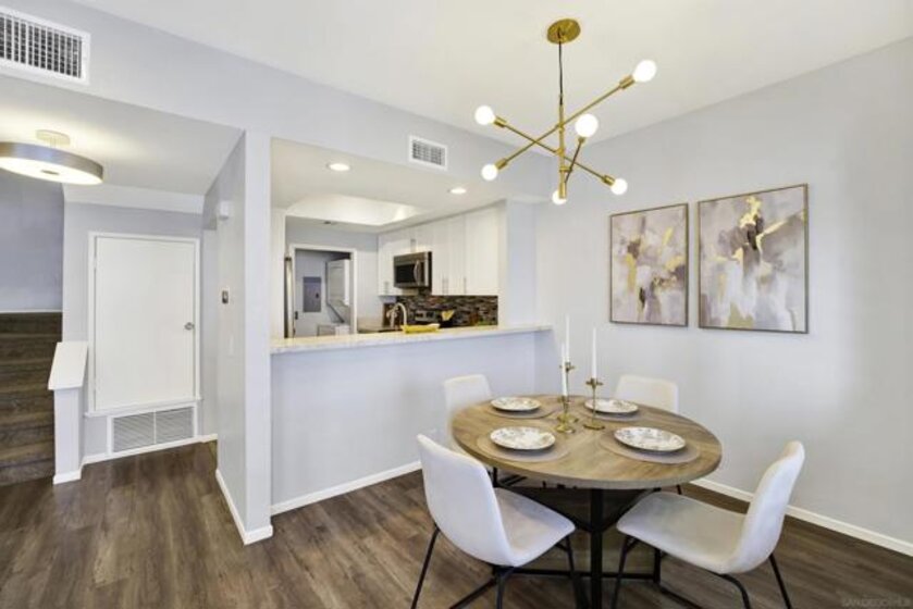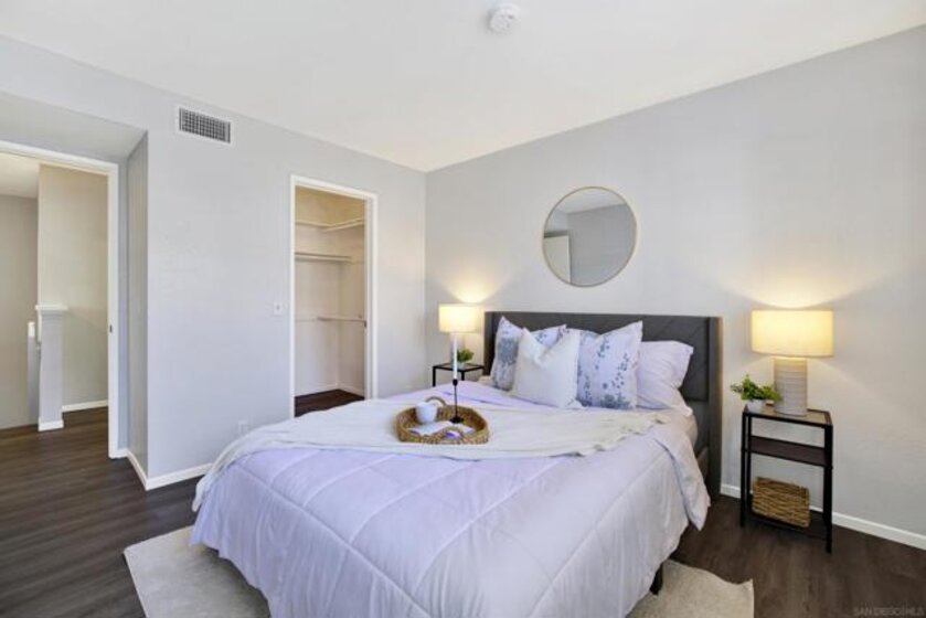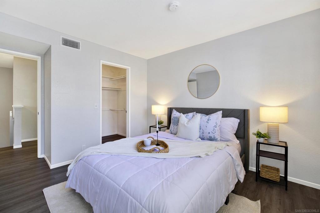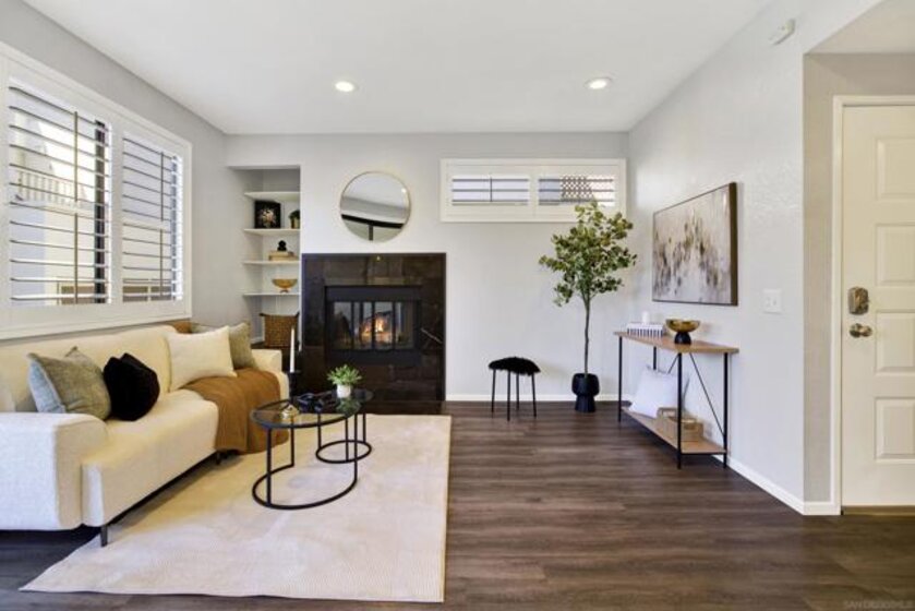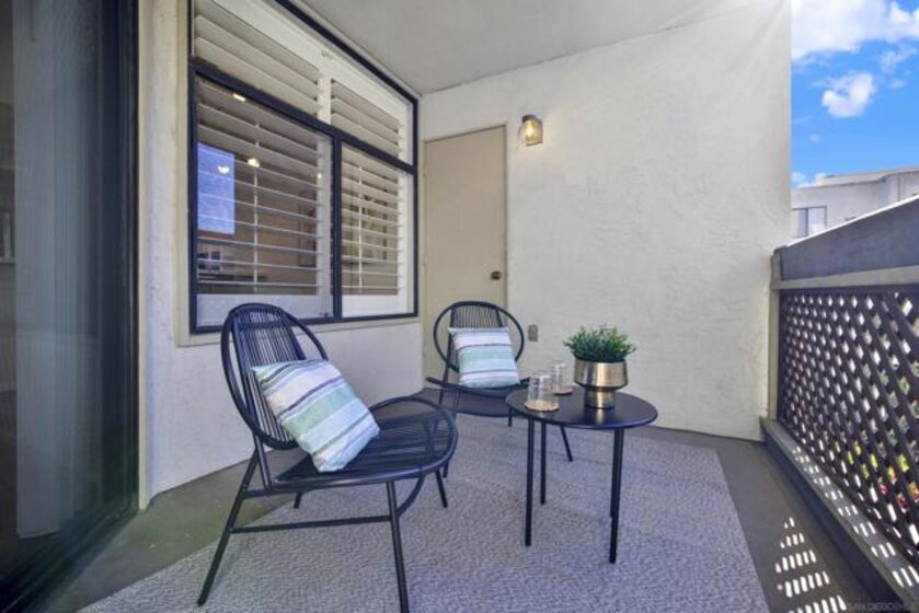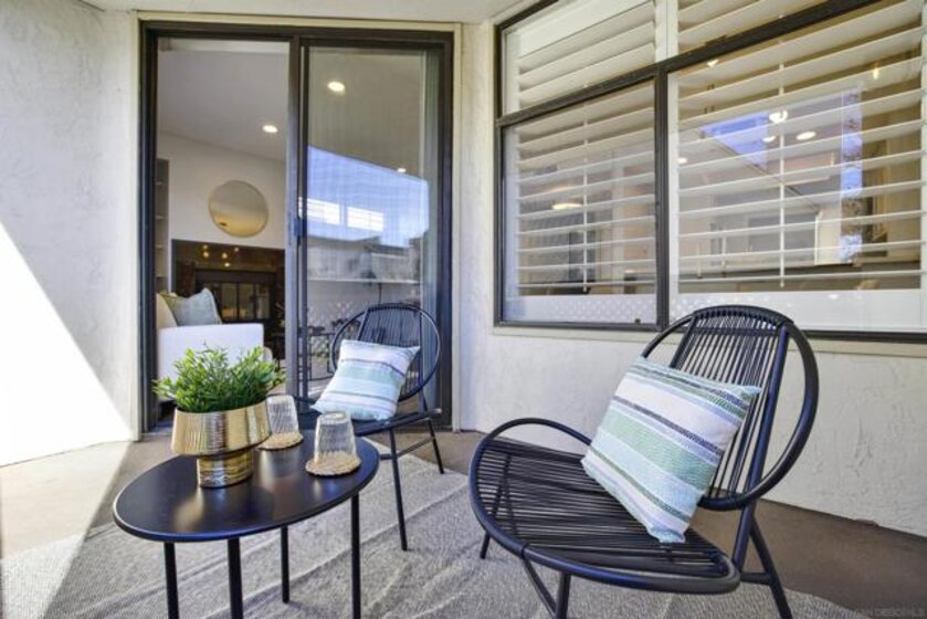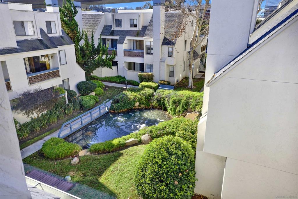 Highly sought-after Mission Valley location with unbeatable convenience! This rare upstairs unit, two-story condo has two separate entrances, and an open floor plan with natural light. Featuring 2 bedrooms and 1 full bathroom with two skylights, the home is perfectly positioned with tranquil pond & water-feature views from the generously sized balcony—an ideal spot to relax & unwind. Inside, enjoy a warm & inviting living space complete with a newly upgraded in-unit laundry, a wood-burning fireplace, recessed lighting, plantation shutters & stainless steel appliances. Central heat & air conditioning! Thoughtful upgrades include a Nest thermostat and a Schlage electronic door lock for modern comfort & peace of mind. A unique bonus to this unit is the additional private patio with a separate top-floor entrance—perfect for enjoying fresh air, a quiet retreat, or a convenient pet area as well as 2 assigned parking spots. The well-maintained complex offers great amenities including a pool & jacuzzi, expansive lounge area with two BBQ pits, ample patio seating with umbrellas, private bathrooms & a fully equipped gym—all securely accessible to owners only. Centrally located near shopping, dining, trolley, entertainment & major freeways, this Mission Valley condo truly offers the best of San Diego living.