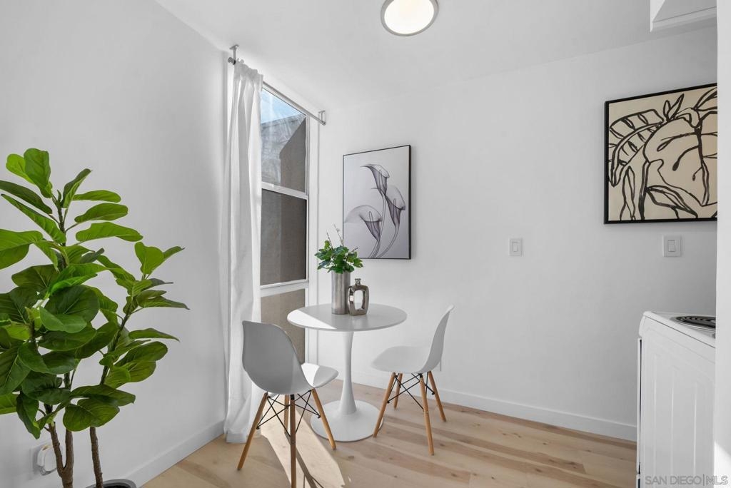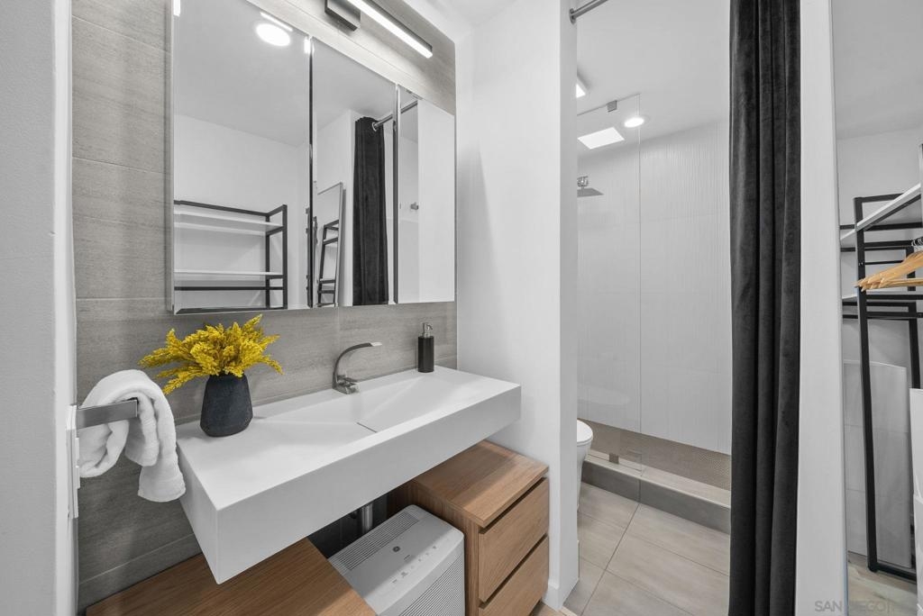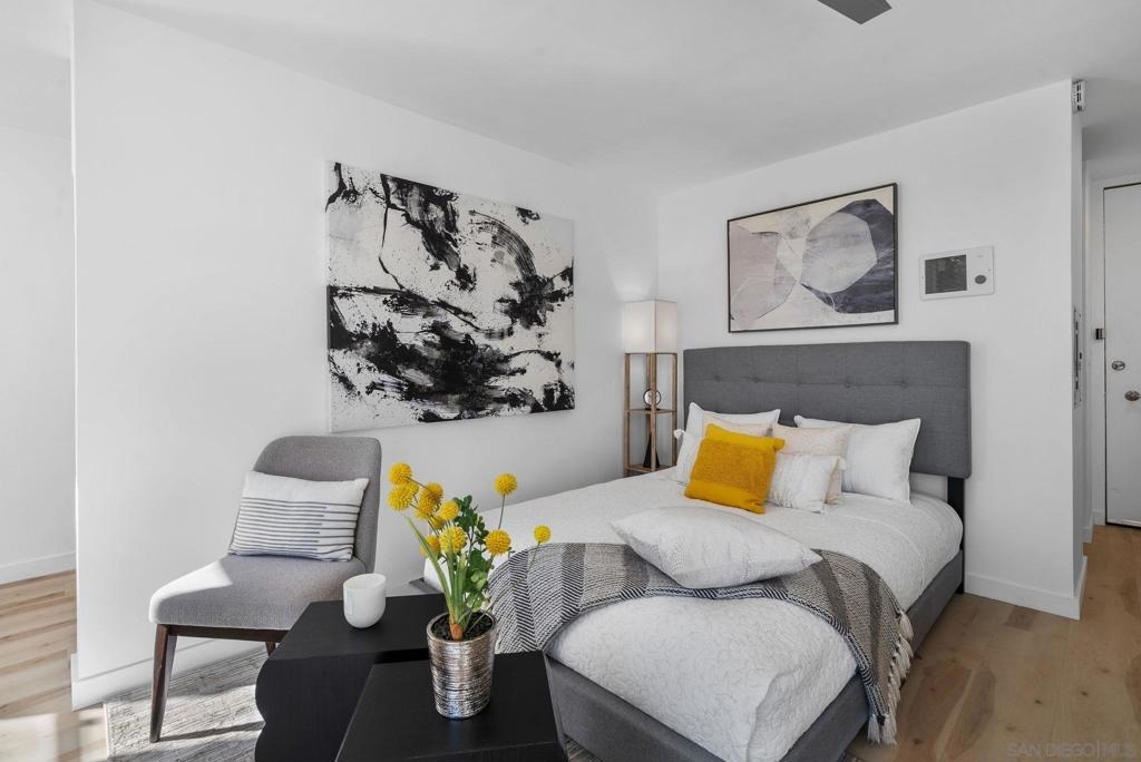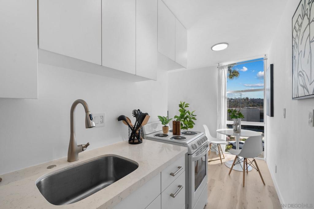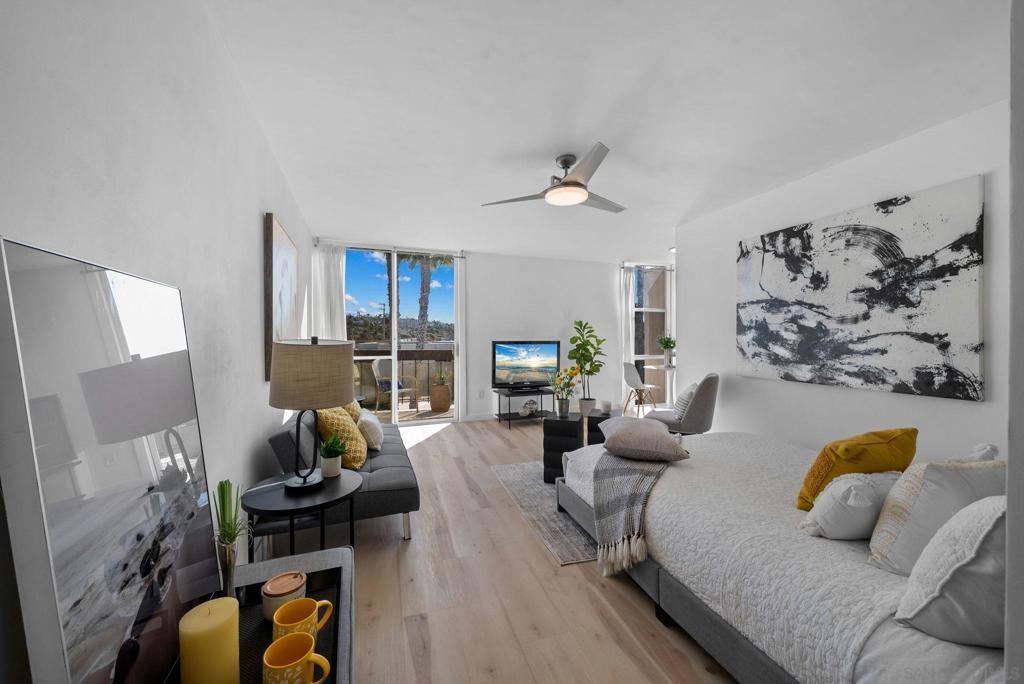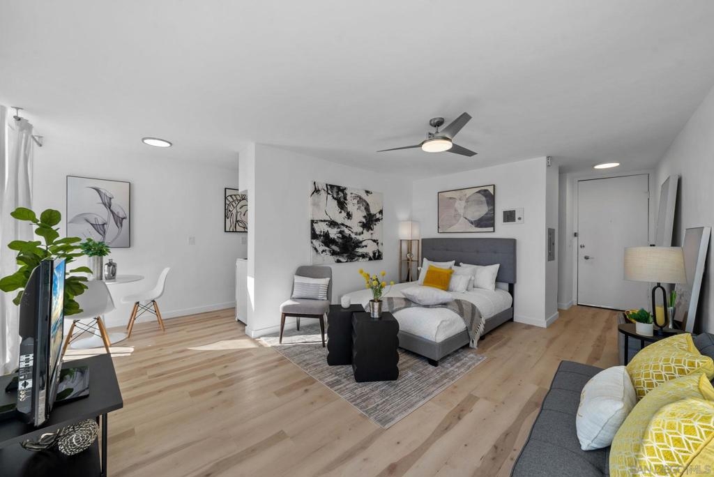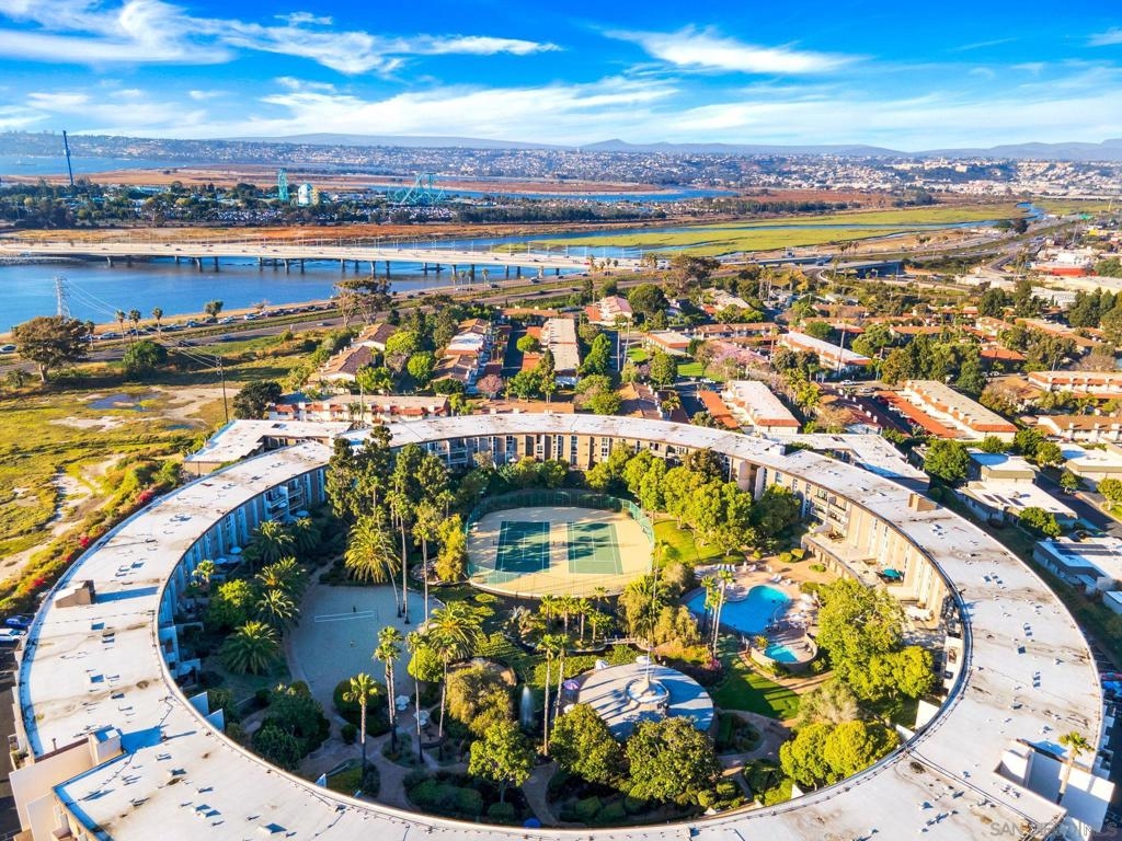 Beautifully updated TOP FLOOR modern condo in the heart of San Diego's highly desirable and coastal Point Loma! This spacious studio is an end unit with only one shared wall! Gorgeous finishes and tons of natural light with large balcony off living room to enjoy lovely views, breakfast area, large bathroom, rare IN-UNIT laundry, perfect for comfort and style. Features include newer: paint, LVP flooring, appliances, tiled shower with frameless glass panel, sink, faucet, mirrors, light fixtures, electrical panel, modern closet with storage. Complete with a parking space, storage locker, incredible amenities with a sparkling pool, spa, fitness center, tennis courts, sand volleyball court, BBQ areas and more—all within a gated complex that exudes resort vibes year-round. Minutes from Mission Bay, beaches, San Diego’s finest dining and shopping, this home offers the perfect balance of convenience and tranquility. This isn't just a condo, it's a lifestyle in one of San Diego’s premier communities!