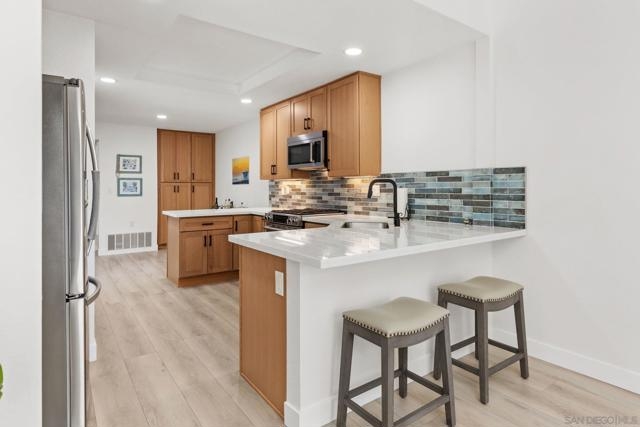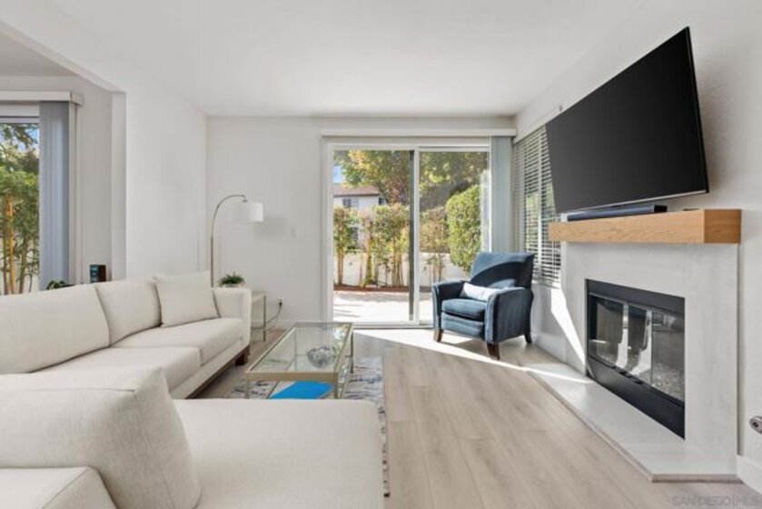 Stunning recent remodel in the coveted East Bluff community of Del Mar Highlands. This 3 bed, 2.5 bath home feels like a single-family residence with wonderful privacy, surrounded by trees, nature, and a charming courtyard on a quiet cul-de-sac. Updated throughout with a remodeled kitchen featuring new shaker cabinets, quartz counters, updated lighting, fresh paint, new fixtures, and floors. Cozy updated gas fireplace for cool nights. Light and bright open floor plan with brand-new dual-pane windows and custom blinds/shades. Enjoy a spacious primary bedroom with vaulted ceilings, walk-in closet, and en-suite bath. Unbeatable location close to One Paseo, Del Mar Beach, Torrey Pines, and award-winning schools. Don’t miss this coastal vibe home!