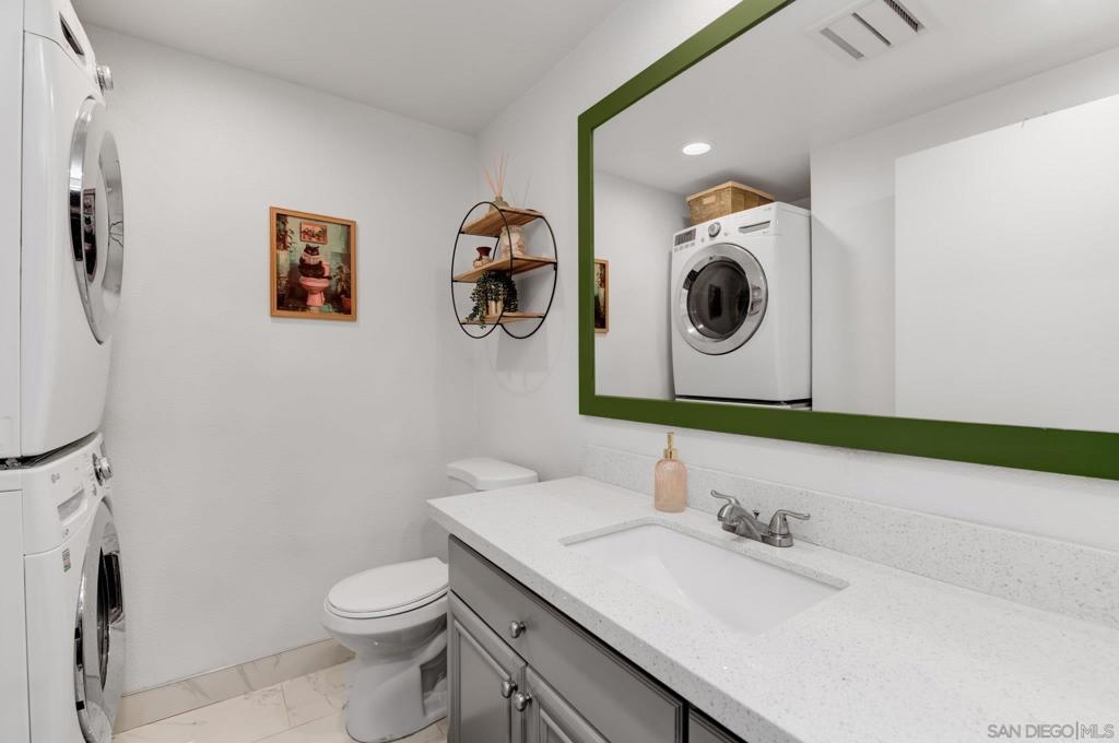 Modern comfort meets prime location just minutes from San Diego State University! Nestled on a quiet street near the end of the neighborhood, this beautifully upgraded townhome offers peace and convenience in the heart of San Diego—close to shopping, dining, and everything you need. Part of a small, well-kept complex with only four units per building, this home includes a secure gated garage space directly beneath the unit plus plenty of street parking. Inside, enjoy brand new dual-pane vinyl windows, luxury vinyl plank flooring throughout, and tile in both bathrooms. The remodeled kitchen and baths feature sleek quartz countertops, and the downstairs half bath includes an in-unit stacked laundry set. A private patio off the kitchen provides the perfect outdoor retreat. Upstairs, both spacious bedrooms sit on opposite ends for privacy, joined by a full Jack-and-Jill bath with a separate toilet room. The primary suite boasts a custom built-in closet system, and both bedrooms include ceiling fans. HOA covers water, sewer, trash, exterior maintenance, and the roof for just $350/month. VA/FHA approved and move-in ready with a brand-new refrigerator and Wi-Fi flush-mount lights—clean, fresh, and perfect for first-time buyers or service members!