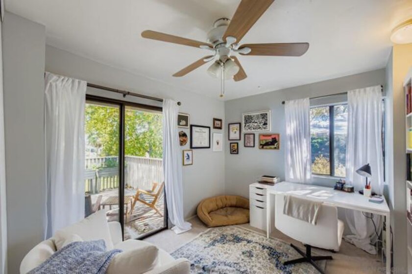 This spacious 3 bedroom townhome in Playmor Terrace West blends comfort and convenience in a prime central UTC close location. The open floor plan on the main level features wood style LVP flooring, a bright living and dining area with a cozy fireplace, and an updated kitchen with granite counters, stainless appliances, and plenty of cabinet space. French doors open to a private patio ideal for outdoor lounging or dining. A full laundry room and guest half bath complete the first floor. Upstairs, the generous primary suite offers fantastic natural light, excellent closet space and access to a sunny balcony with views to the canyon and the greenbelt. Two additional bedrooms and two full baths provide great flexibility for work-from-home, guests, or family needs. Other highlights include a whole house fan, ceiling fans in all bedrooms, a skylight over the stairway, and two assigned parking spaces—one covered, one uncovered. The community features two pools, lush pathways, and a peaceful atmosphere, all just minutes to UCSD, shopping, dining, parks, and major freeways.