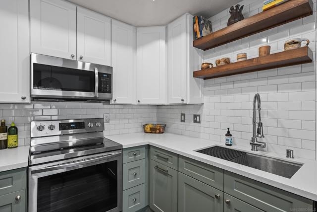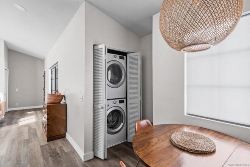Flooded with natural light, this upper-level unit pairs thoughtful design with everyday comfort. Vaulted ceilings and high windows create an airy, open feel, while the living room fireplace adds warmth and character. The kitchen was reimagined to include an extended coffee bar and open shelving, blending style and function with stainless steel appliances and clean modern finishes. Both bathrooms have been updated, and new flooring runs throughout, tying the spaces together. Spacious bedrooms offer peaceful retreats, each with ample storage and soft natural light. Additional comforts include central HVAC, an in-unit stacked washer and dryer, a private one-car garage, and an additional driveway space. Tucked within a quiet, 7-unit complex, this home sits just steps from University Heights’ local cafés, bars, restaurants, schools and parks. A perfect mix of design, convenience, and walkable city living in one of San Diego’s most beloved neighborhoods.