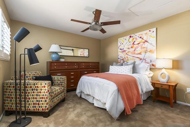 Conveniently located for commuters, this beautifully remodeled 3 bedroom, 2 bath end-unit townhome. Primary on the main level.Highly sought-after Villa Monterey community offers both accessibility & serenity. The surprisingly quiet interior benefits from upgraded dual-pane windows that minimize outside noise and create a peaceful retreat. Beautiful canyon views are right outside your windows. The custom patio deck is in a category of its own made from environmentally friendly engineered bamboo. The living area, kitchen, and primary bedroom each open through plantation shutters which are throughout the home. Step inside to discover bright, cheerful spaces ready for your personal touch. The open-concept floor plan, 36-inch wide doorway to the first-floor primary suite and bathroom, and spacious layout ensure easy accessibility throughout. The custom kitchen is a standout, featuring natural stone counters, updated lighting, and premium appliances: Viking gas cooktop, Dacor electric oven, Bosch dishwasher, travertine farm sink, built-in KitchenAid refrigerator, microwave, and pot filler — all framed by elegant Taj Mahal quartzite countertops. The primary suite offers vaulted ceilings, a skylight for stargazing, and a walk-in closet. Both bathrooms have been fully remodeled with marble, granite, subway tile, and custom glass doors. Additional highlights include a separate den or office, full-size laundry/utility room, newer interior doors, recessed lighting. A two-car detached garage provides abundant storage, and the community even offers on-site RV parking for $100 per month!