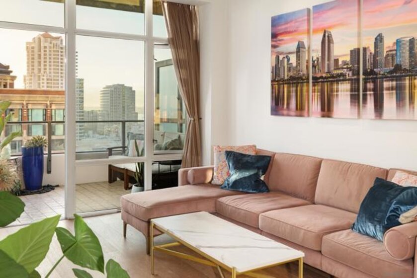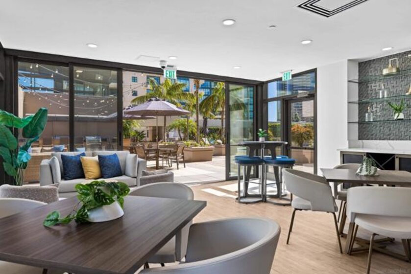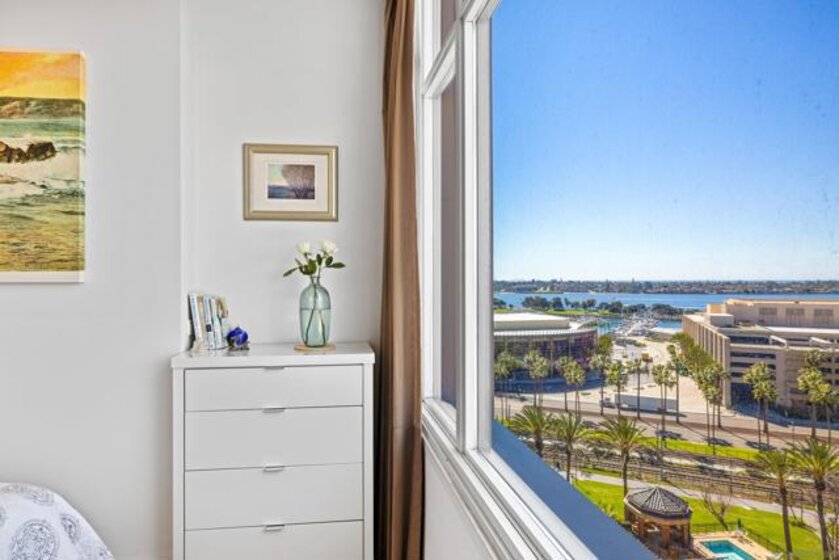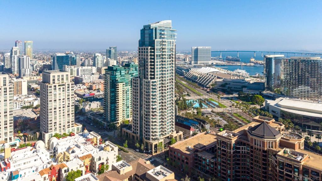 Perched on the highest floor available for a one-bedroom residence, Unit 1007 at The Pinnacle offers a rare combination of elevated design, natural light, and sweeping panoramic views in the heart of the Marina District. Expansive floor-to-ceiling windows frame stunning west and southwest-facing vistas, filling the home with light and showcasing San Diego’s signature sunsets. This thoughtfully designed residence features soaring 10-foot ceilings, rich DuChâteau natural wood flooring, and elegant French doors that open to a serene primary suite with a spacious walk-in closet. The spa-inspired bath is appointed with a custom walk-in shower and sleek floating vanity, creating a calm, refined retreat. The kitchen blends form and function with premium appliances including Miele oven, cooktop, and dishwasher, a Sub-Zero refrigerator, Snaidero hood, and granite countertops, all designed for both everyday living and entertaining. Residents of The Pinnacle enjoy resort-style amenities, including a 95-foot lap pool, state-of-the-art fitness center, and updated conference facilities, along with full-service luxury living.Ideally located just moments from the waterfront, Seaport Village, and some of downtown San Diego’s best dining and entertainment, this exceptional high-floor residence offers a sophisticated urban lifestyle in one of the city’s most desirable buildings.
