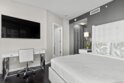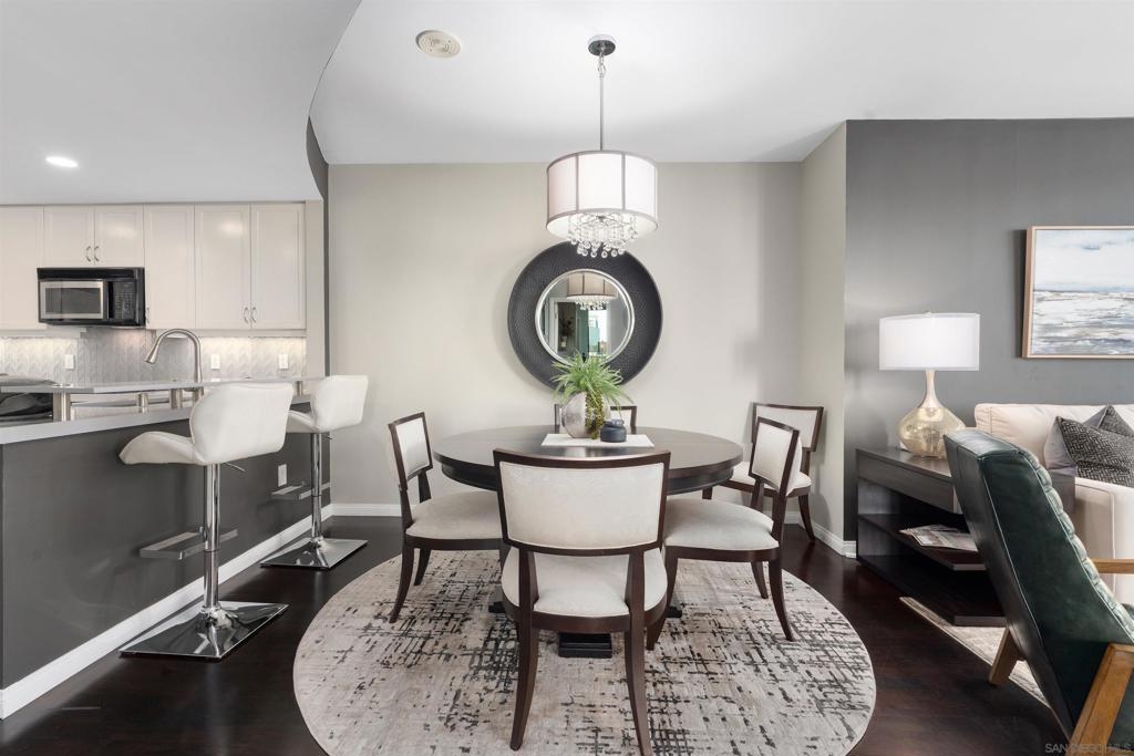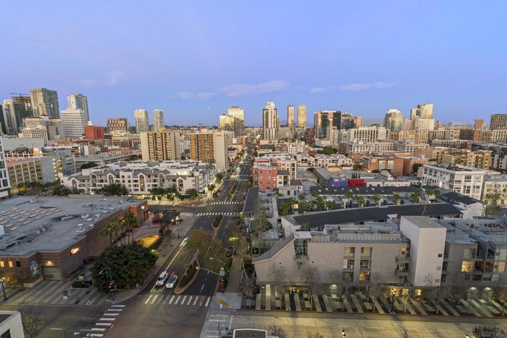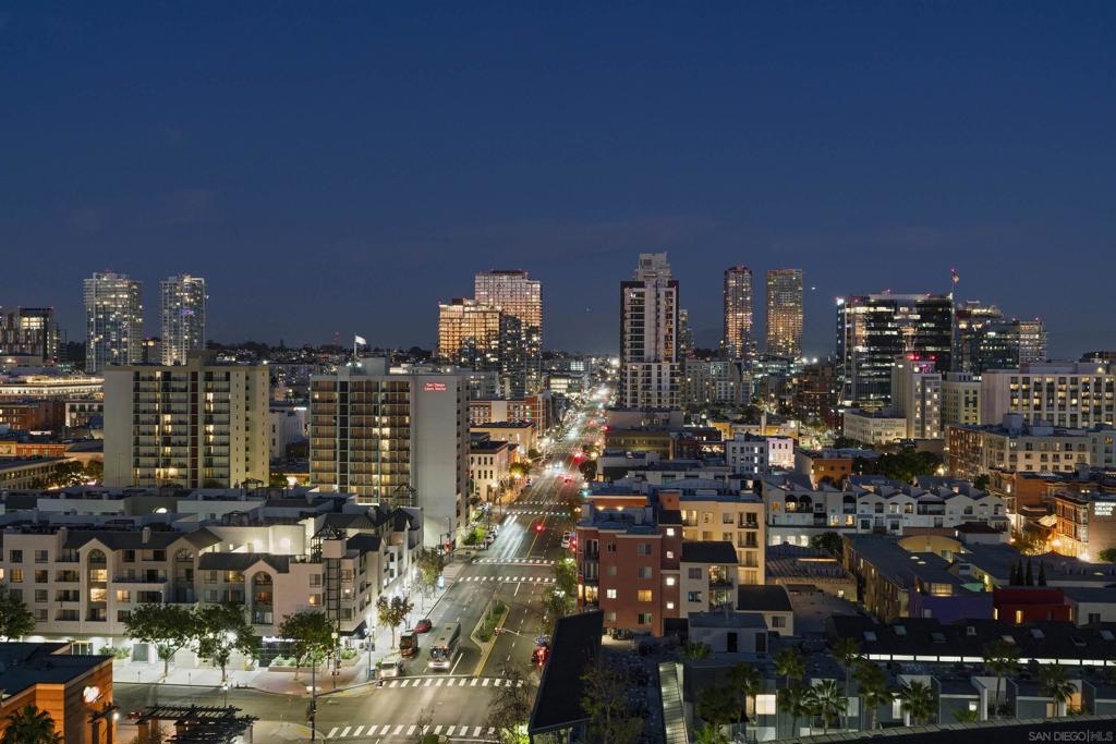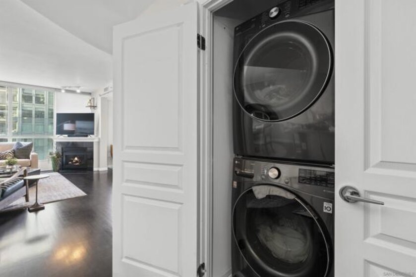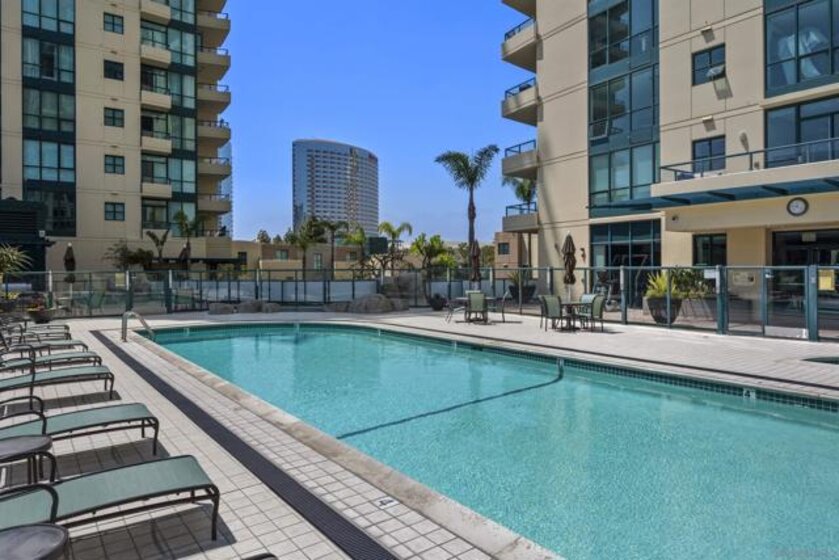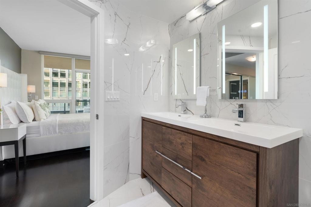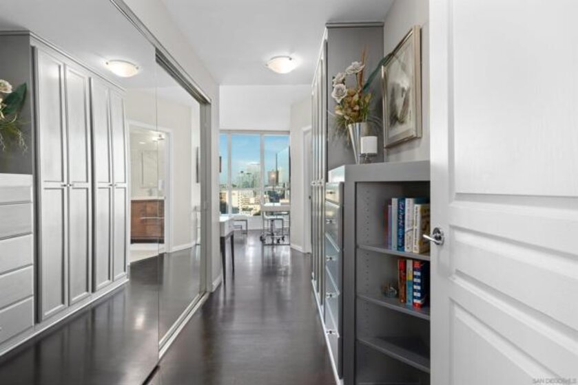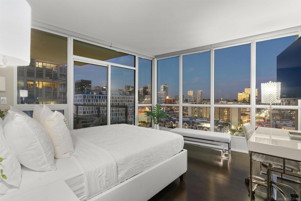 This beautiful, professionally designed one-bedroom plus Den, two-bath condo offers luxury, comfort, and stunning north-facing views of San Diego Bay and Downtown city skyline. Natural light fills the open living and dining areas, with large windows and a spacious patio to take in the scenery. The primary suite features floor-to-ceiling windows, generous closet space, built-ins, a workspace, patio access, and an ensuite bath with dual sinks and a walk-in shower. A versatile den off the living room - with direct patio access - functions as a cozy lounge by day and a guest bedroom with a queen sleeper sofa by night. Furnishings to be included in the purchase price at no additional cost to Buyer. Original cost of furnishings was approximately $30,000, with the majority sourced from Arhaus, Pottery Barn, and Crate & Barrel. All included items to be conveyed in their current condition at close of escrow. Ideally located in the heart of the Marina District, Horizons offers an unbeatable downtown lifestyle just steps from the New Children’s Museum, Martin Luther King Jr. Promenade, Seaport Village, Petco Park, the Gaslamp Quarter, San Diego Bay, and the Marina. A children’s park and dog park are located directly behind the community. Resort-style amenities include a pool, spa, BBQ area, fitness center, concierge, security, billiard room, conference and club rooms, and 16 guest parking spaces. Everyday convenience is built in with retailers just an elevator ride away, including a bank, dry cleaner, Postal Annex, coffee shop, and more. The building has been refreshed with beautifully remodeled lobbies, upgraded hallways, and new unit doors with keypad access, all within walking distance to transit, dining, shopping, and Ralphs Signature Market.