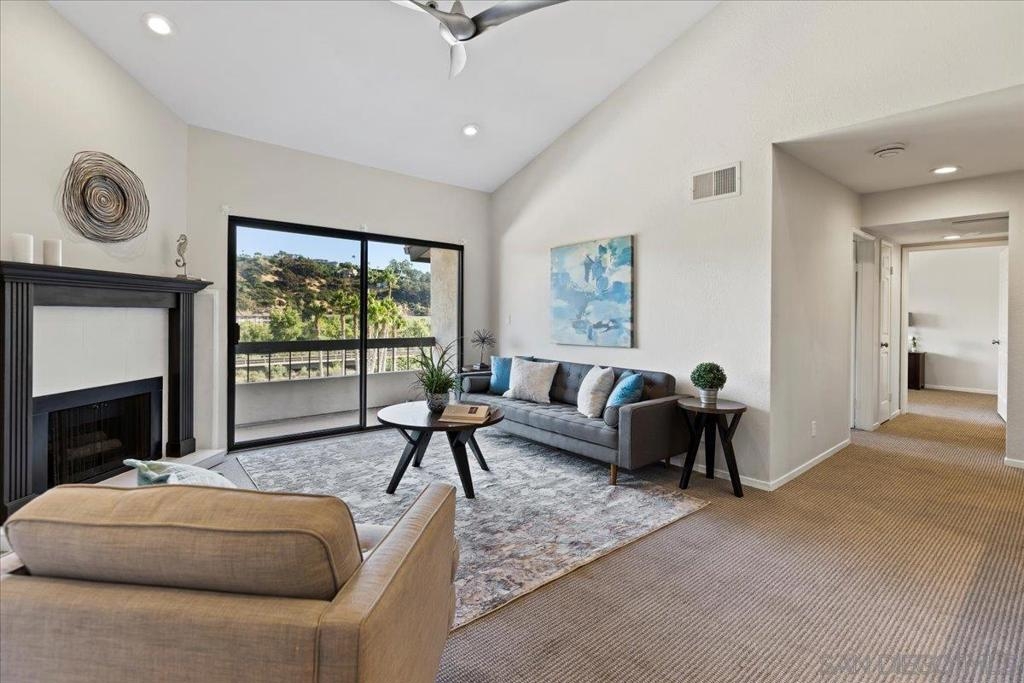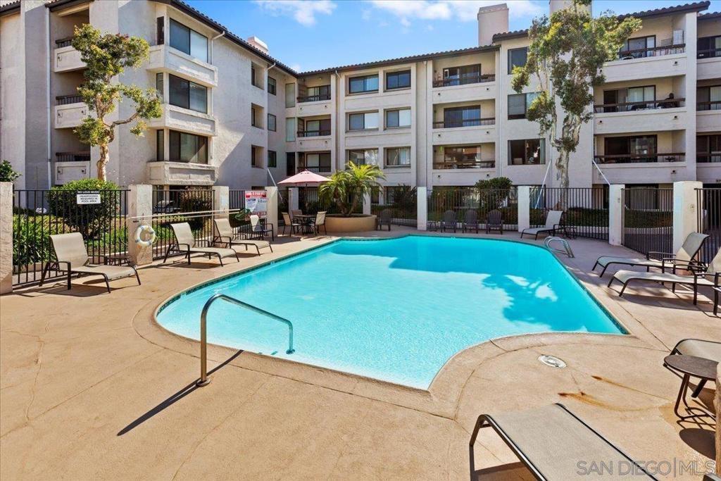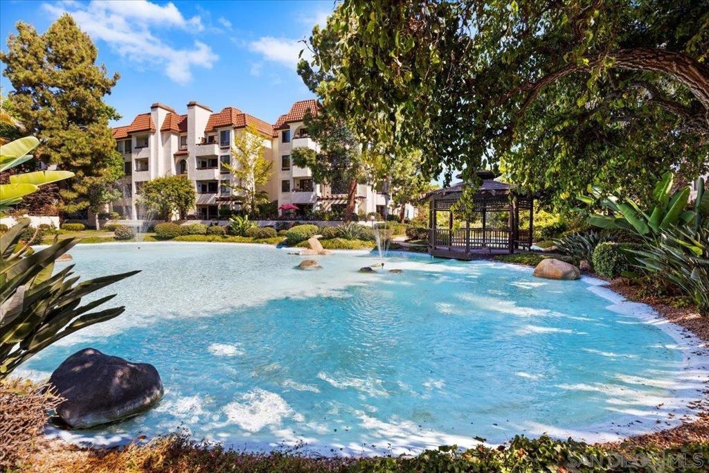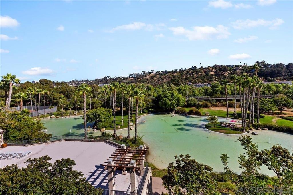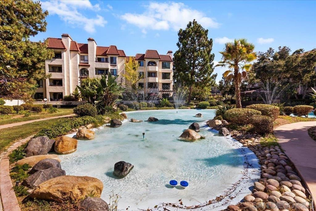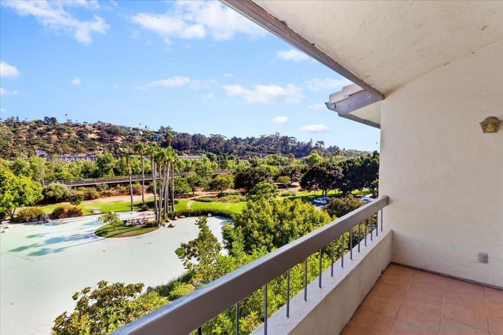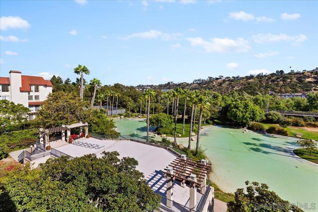 Embrace luxury living in this move-in ready, top-floor unit featuring 2 bedrooms and 2 bathrooms, with breathtaking southern views of the mountains and lagoon below. The expansive, vaulted ceilings and private balcony enhance the open and airy ambiance, while the neutral color palette provides a timeless backdrop. The designer kitchen is a chef's dream, boasting granite countertops, a breakfast bar and stainless steel appliances. Recessed lighting, central air and heat, cozy fireplace and ceiling fans with remotes add to the comfort and sophistication. The primary suite offers a large walk-in closet and ample counter space, complemented by the convenience of an in-unit washer and dryer. This exquisite residence includes underground parking and is nestled within a resort-style complex that offers 24-hour gated security, a pool, spa, clubhouse, basketball and racquetball courts, picnic areas, and lush landscaping. Located just minutes from the beaches, downtown, Balboa Park, Fashion Valley Mall, the airport, and an array of restaurants, with easy freeway access, this home truly has it all. Don't miss the opportunity to experience this exceptional property—it's a must-see!