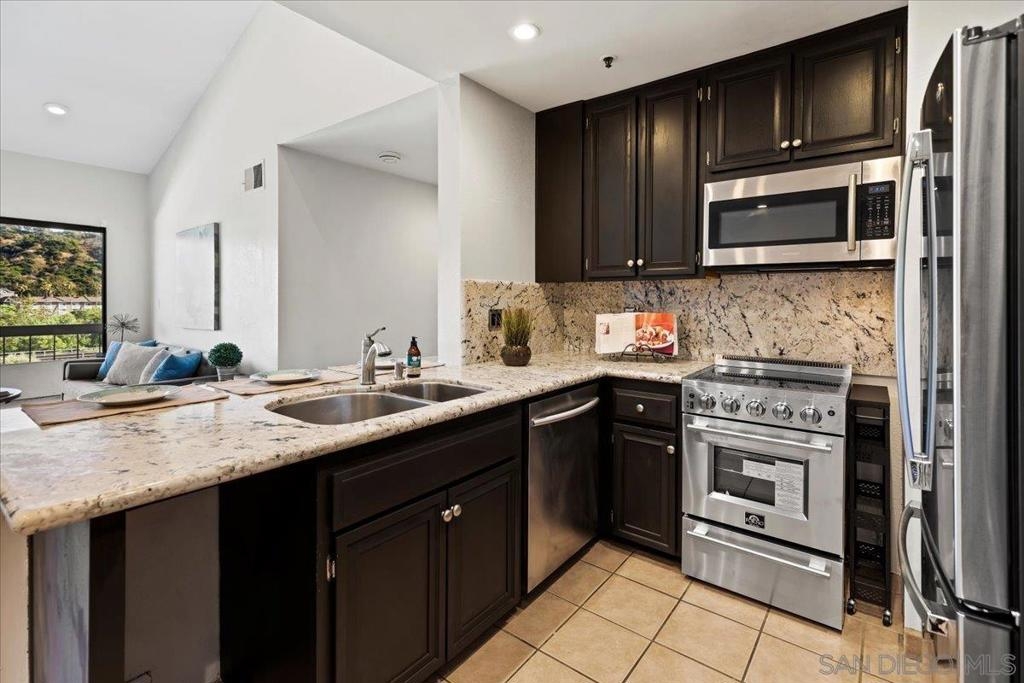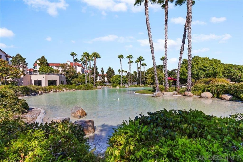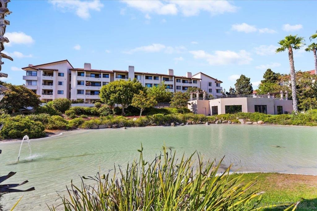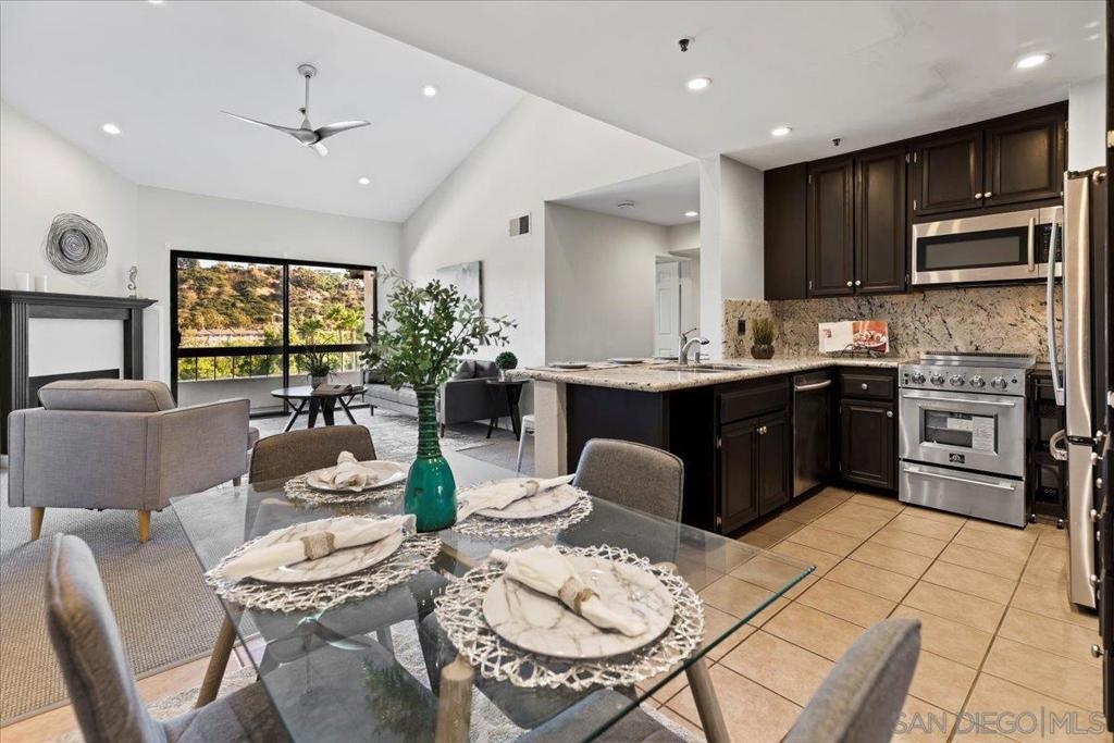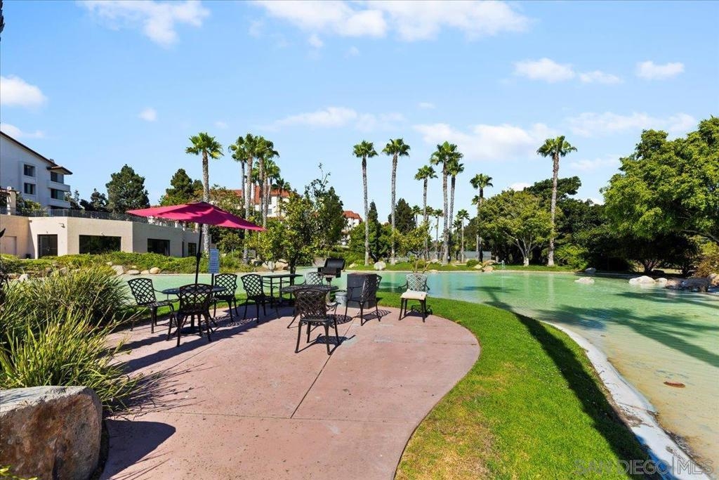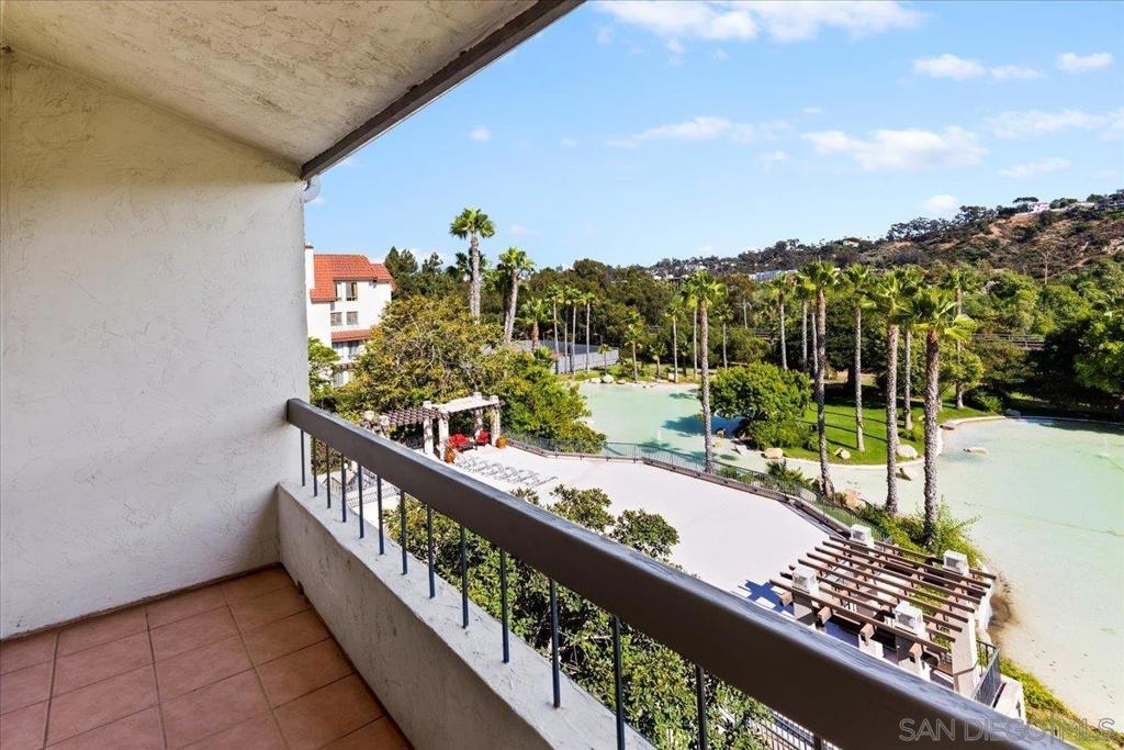 Embrace luxury living in this move-in ready, top-floor unit featuring 2 bedrooms and 2 bathrooms, with breathtaking southern views of the mountains and lagoon below. The expansive, vaulted ceilings and private balcony enhance the open and airy ambiance, while the neutral color palette provides a timeless backdrop. The designer kitchen is a chef's dream, boasting granite countertops, a breakfast bar and stainless steel appliances. Recessed lighting, central air and heat, cozy fireplace and ceiling fans with remotes add to the comfort and sophistication. The primary suite offers a large walk-in closet and ample counter space, complemented by the convenience of an in-unit washer and dryer. This exquisite residence includes underground parking and is nestled within a resort-style complex that offers 24-hour gated security, a pool, spa, clubhouse, basketball and racquetball courts, picnic areas, and lush landscaping. Located just minutes from the beaches, downtown, Balboa Park, Fashion Valley Mall, the airport, and an array of restaurants, with easy freeway access, this home truly has it all. Don't miss the opportunity to experience this exceptional property—it's a must-see!