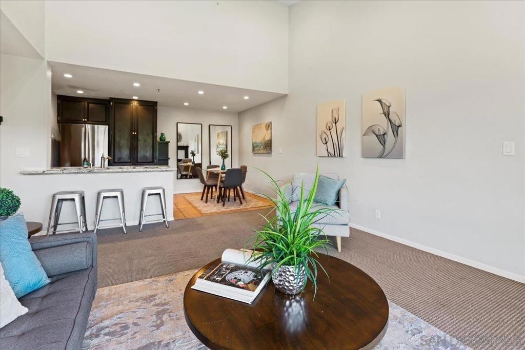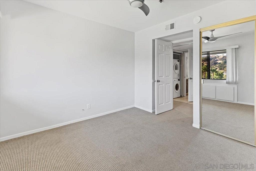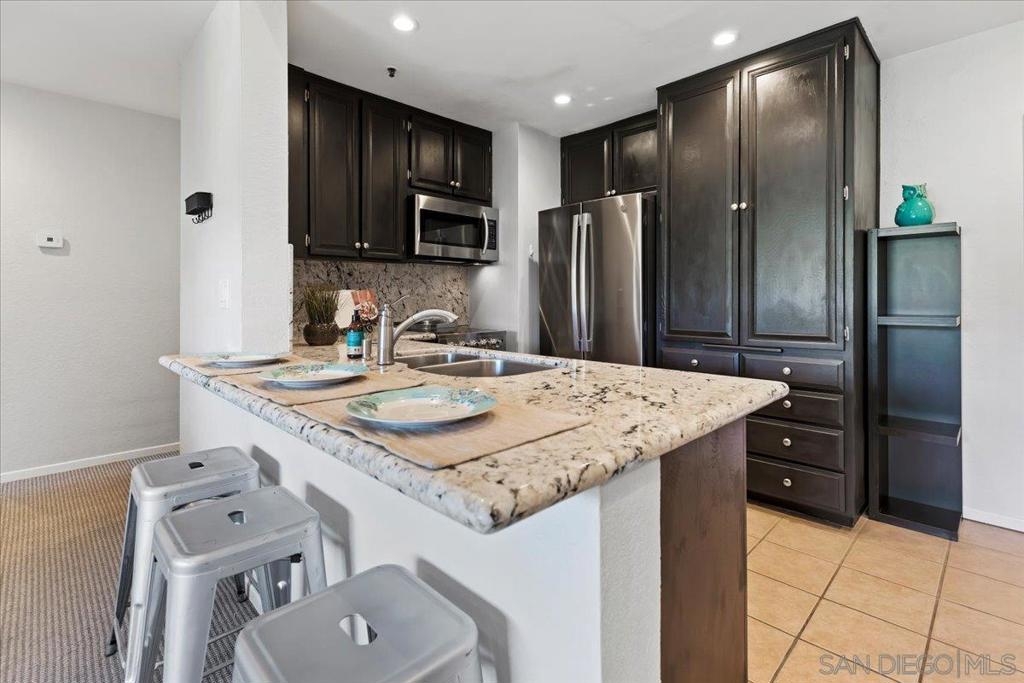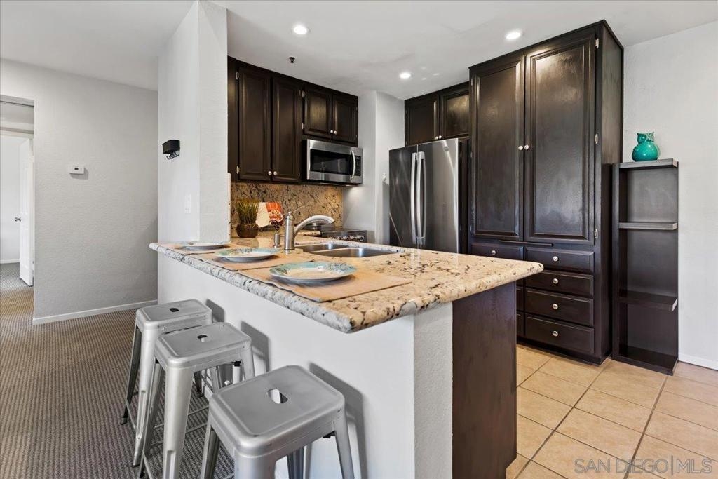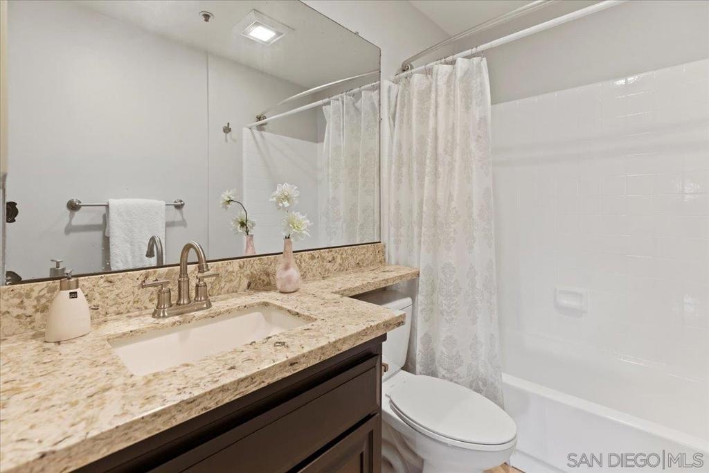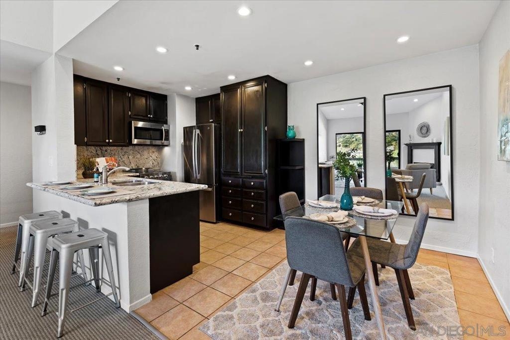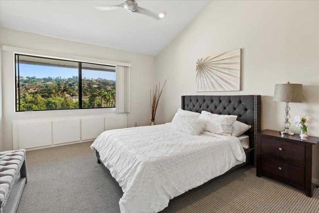 Embrace luxury living in this move-in ready, top-floor unit featuring 2 bedrooms and 2 bathrooms, with breathtaking southern views of the mountains and lagoon below. The expansive, vaulted ceilings and private balcony enhance the open and airy ambiance, while the neutral color palette provides a timeless backdrop. The designer kitchen is a chef's dream, boasting granite countertops, a breakfast bar and stainless steel appliances. Recessed lighting, central air and heat, cozy fireplace and ceiling fans with remotes add to the comfort and sophistication. The primary suite offers a large walk-in closet and ample counter space, complemented by the convenience of an in-unit washer and dryer. This exquisite residence includes underground parking and is nestled within a resort-style complex that offers 24-hour gated security, a pool, spa, clubhouse, basketball and racquetball courts, picnic areas, and lush landscaping. Located just minutes from the beaches, downtown, Balboa Park, Fashion Valley Mall, the airport, and an array of restaurants, with easy freeway access, this home truly has it all. Don't miss the opportunity to experience this exceptional property—it's a must-see!