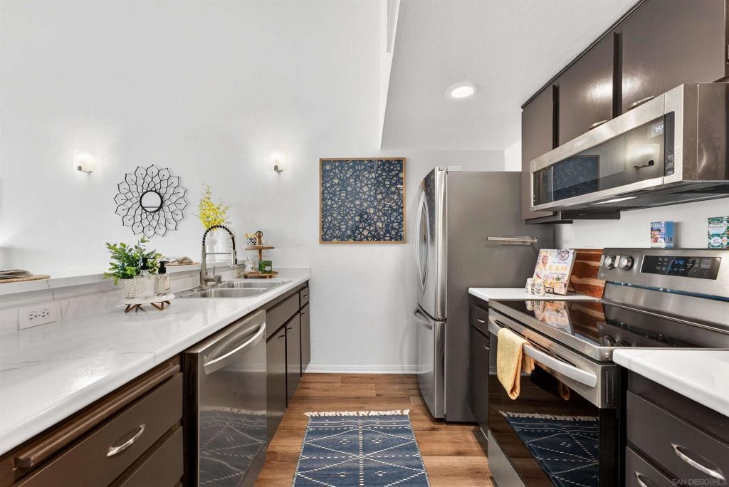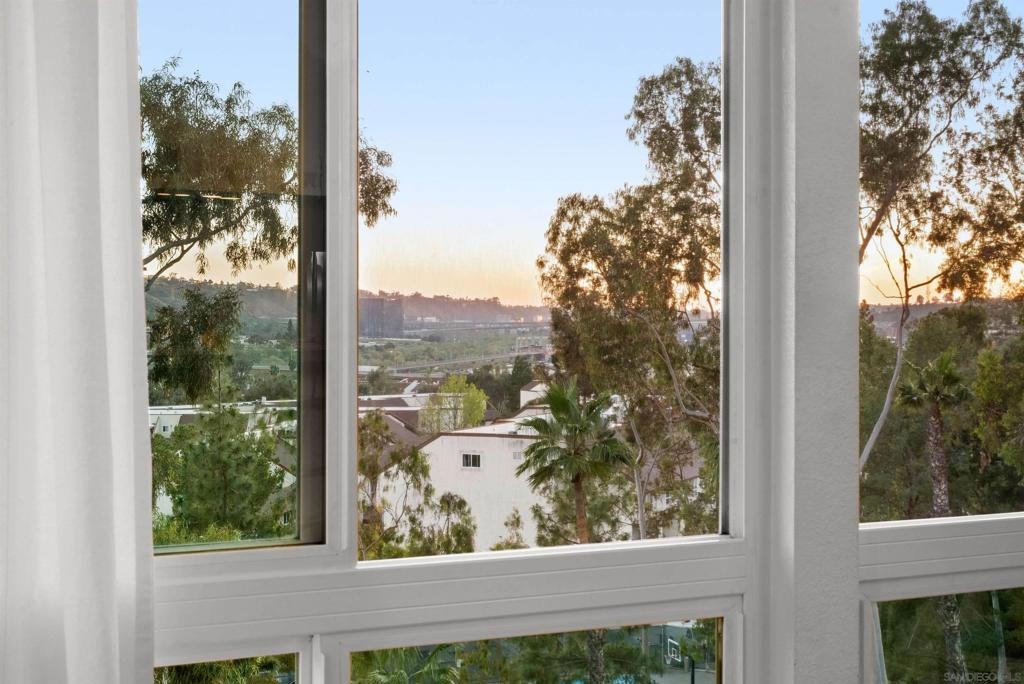 Top-floor loft-style condo with soaring vaulted ceilings and expansive valley & sunset views through newer oversized windows that fill the home with natural light. Open loft design creates a bright, airy feel. Turnkey with fresh designer paint, updated flooring, newer appliances, and quality fixtures. Loft features new double-door mirrored closets, plus an oversized mirrored closet downstairs and walk-in pantry for abundant storage. Flexible space with custom live edge wood countertop can be used as a workspace or bar. Additional features include central A/C, elevator access, and a well-maintained community with pool, spa, clubhouse, and laundry facilities. One assigned parking space. Ideally located in Mission Valley near trolley, shopping, dining, theaters, fitness centers, beaches, and major freeways. Furnishings negotiable—ideal for first-time buyers, investors, or those seeking central San Diego living. Top-floor loft-style condo with soaring vaulted ceilings, no neighbors above, and expansive valley & sunset views through newer oversized windows that flood the home with natural light. The open design creates a light-filled, airy environment that elevates the sense of space. Turnkey & recently refreshed with fresh designer interior paint, updated flooring, newer appliances, & quality fixtures. The home features new double-door mirrored closets, complemented by an oversized mirrored closet downstairs & a walk-in pantry—offering abundant & well-designed storage throughout. A versatile flex space with a custom live edge wood countertop can be configured as a workspace with existing dual monitor brackets, or reimagined as a dry bar or additional space. Additional upgrades include a Ring doorbell and keyless entry lock for added convenience and security. Enjoy central A/C, elevator access, and a well-maintained community with pool, spa, clubhouse, and laundry facilities, plus one assigned parking space. Ideally located in Mission Valley near major freeways, shopping, dining, theaters, fitness centers, beaches, and the Trolley. Turnkey opportunity with furnishings negotiable—well suited for first-time buyers or investors seeking central San Diego living.