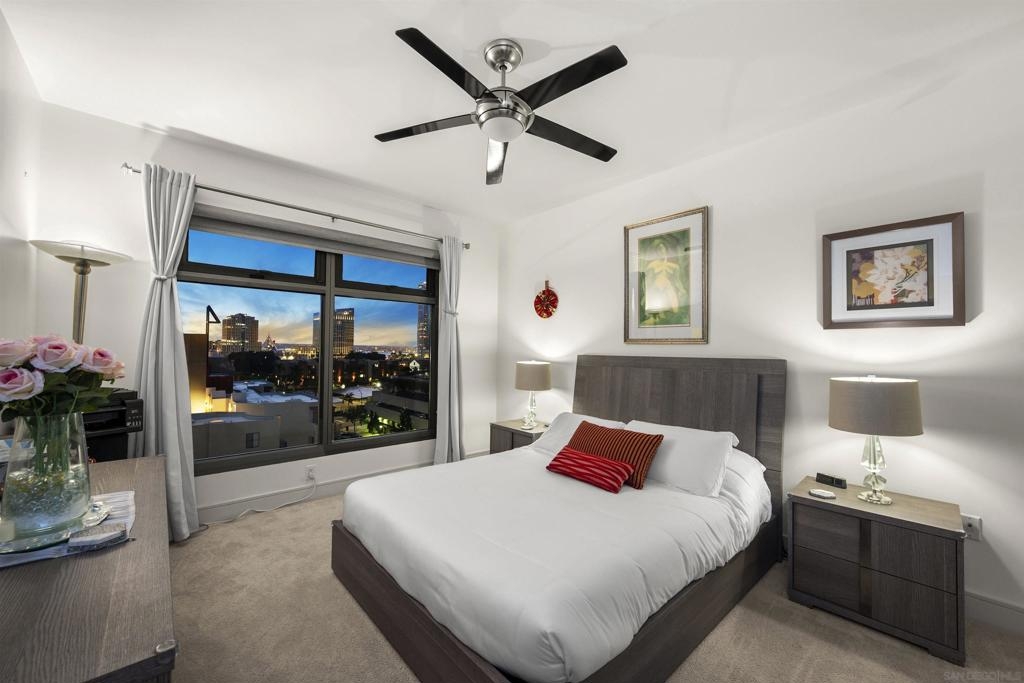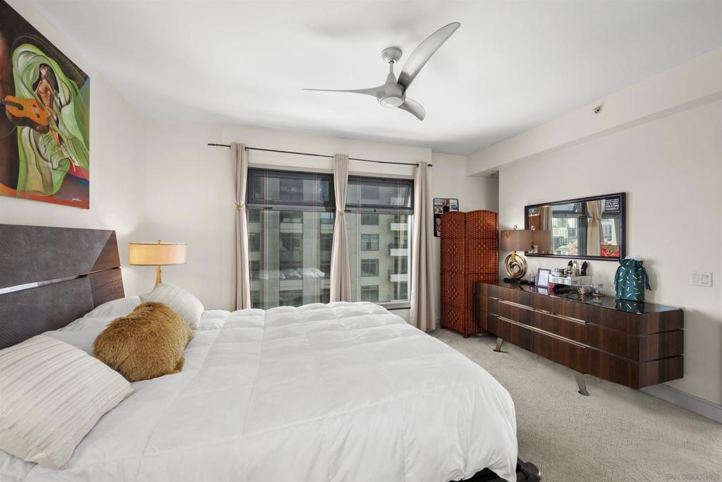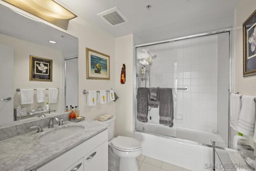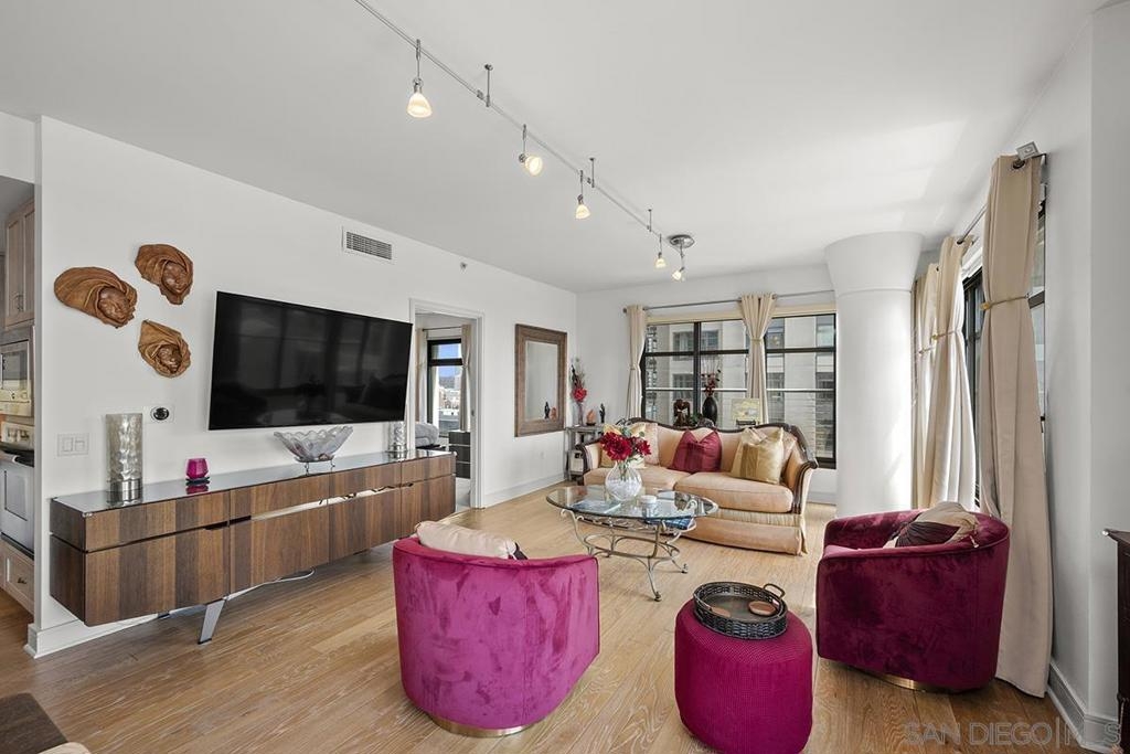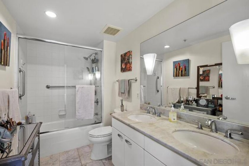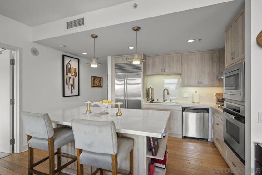 Claim your stake in vibrant urban living with this west-facing residence at Renaissance! Soak in sweeping bay and city views through expansive stacked, sliding windows in the living and dining area, bringing the outdoors in without the upkeep of a balcony. The open-concept kitchen has been thoughtfully upgraded with premium stainless appliances including Viking, GE, and Sub-Zero, complemented by quartz countertops, updated cabinetry, a generous center island, and stylish pendant, recessed, and track lighting. With a dual-suite layout, this home offers exceptional privacy and flexibility for guests, roommates, or a home office setup. The serene primary suite includes plush carpeting, a walk-in closet, and a spa-inspired bath with dual vanities. Additional features include beautiful wood flooring throughout the main living areas, storage unit, and tandem parking spaces. Live in the heart of the Marina District with world-class dining, shopping, and the waterfront just steps away Located on arguably one of the most convenient blocks in all of Downtown, just a few blocks to walk along the harbor, public transportation, excellent restaurants, shopping, Ralphs Signature grocery store next door, and the brand-new Rady’s Shell at Jacobs Park, a unique live music venue and home of the San Diego Symphony! Also enjoy proximity to the future life science and biotechnology research development The Research and Development District (The RaDD) at the Embarcadero and the sustainable tech-focused Campus at Horton in the center of the city. Delight in the casual elegance of Renaissance amidst the convenience of sophisticated urban living. Renaissance common areas have been recently refreshed and refurbished and include staffed lobbies, 24/7 security, pool & spa, barbecues, lounge areas, an outdoor fireplace, a well-equipped fitness center, and meeting rooms. Don’t miss your chance to call this special residence your own!