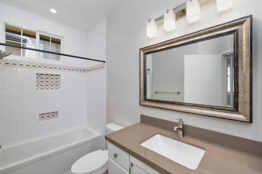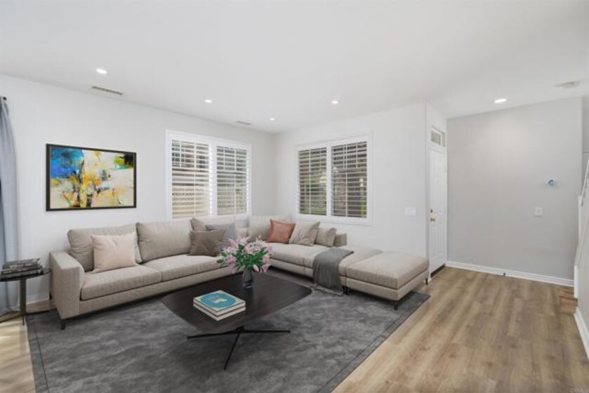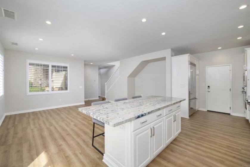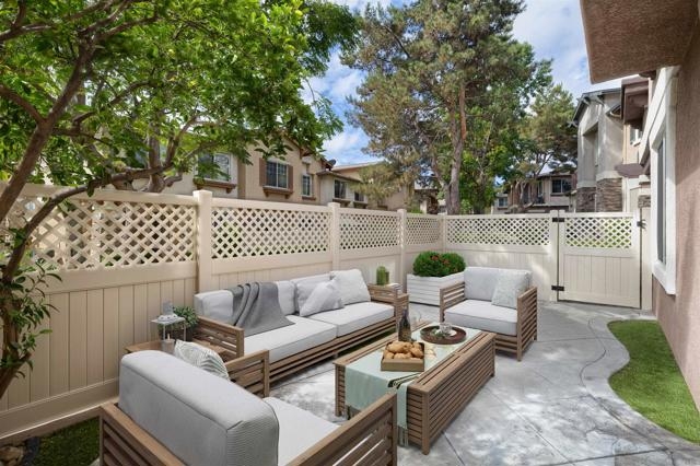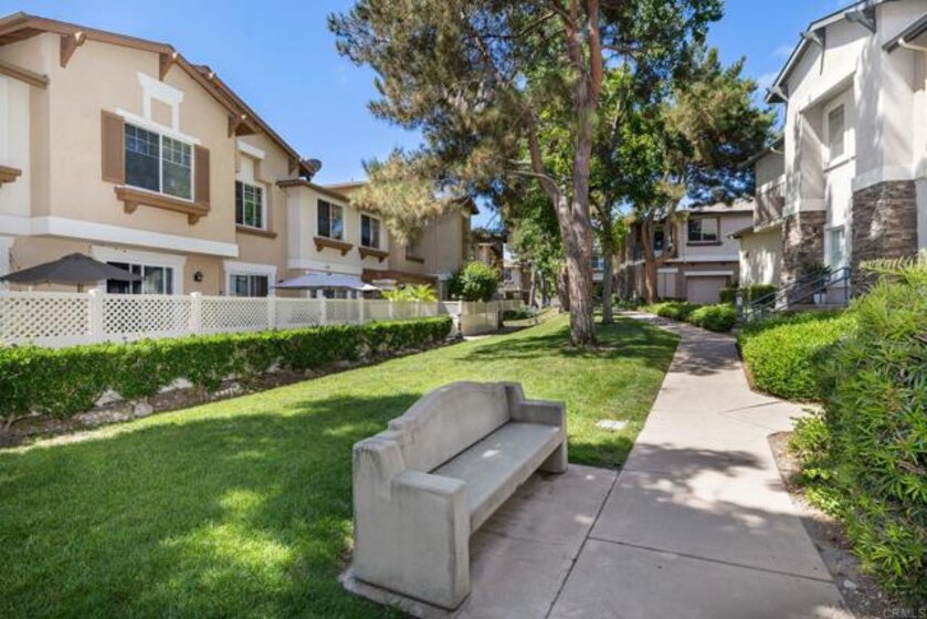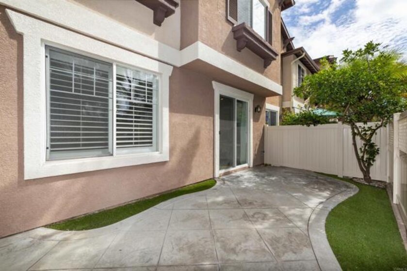 Beautifully updated 3-bedroom townhome in one of the most desirable locations within Stonecrest Village. Enjoy the convenience of a 2-car attached garage and an oversized south-facing patio—perfect for soaking in the winter sun. The patio features pet-friendly turf, a new vinyl fence, and a thriving lemon tree for your own fresh citrus. Inside, the chef’s kitchen is outfitted with a premium Viking gas cooktop and electric oven, quartz countertops, and generous cabinetry for all your culinary needs. The open-concept living area offers a rare sense of space for a townhome, with room for a large sectional and a built-in alcove for your entertainment setup. Recessed lighting and luxury vinyl plank flooring flow throughout the main level, combining comfort and durability. Upstairs are three bedrooms and two full baths, including a primary suite that feels like a personal spa retreat—complete with a walk-in shower, quartz & tile finishes with nickel fixtures, dimmable lighting, and a full-length closet. Stonecrest Village is known for its resort-like amenities: two swimming pools, a spa, tennis and pickleball courts, a fully equipped fitness center, a massive park with playgrounds, a banquet room, and a resident lounge—all set amid lush, mature landscaping. This is more than a home—it’s a lifestyle.